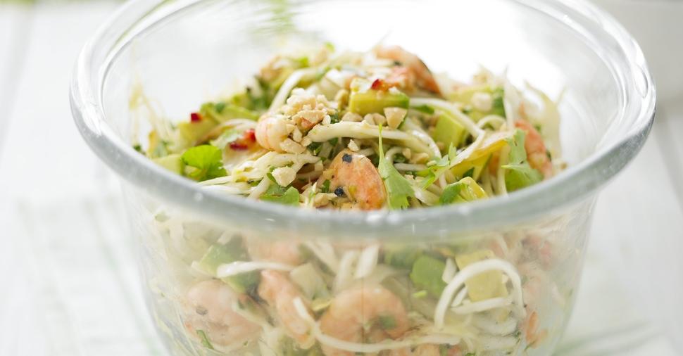 Salade printanière Préparation: 20 minutes - Difficulté: facile INGREDIENTS (pour 2 personnes): 16 Crevettes moyennes décortiquées 1 Avocat ½ Mangue fraîche 1 Citron 1 Coriandre fraîche ¼ Chou chinois 2CS d'huile d'olive 1CS Vinaigre de vin rouge Sel et poivre Facultatif : pâte de piment PRÉPARATION: Émincez le chou très finement ainsi que la coriandre. Pelez et coupez l’avocat en fines lamelles ou en dés ainsi que la mangue. Pressez le citron afin d'en extraire le jus. Verser la moitié du jus de citron sur les lamelles d'avocat, salez et poivrez. Mettez l'autre moitié du jus de citron sur la mangue, salez et poivrez, ajoutez la moitié de la coriandre. Pour l’assaisonnement, mélangez l'huile d'olive, le vinaigre, et la pâte de piment (facultatif), salez, poivrez et brassez vivement afin de réaliser une vinaigrette homogène. Mélangez le tout et déposez sur le dessus les crevettes décortiquées. Belle dégustation. N.B.: Si le chou chinois ne vous convient pas, la mâche fera un mélange tout aussi plaisant !