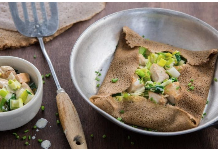 Ingrédients (1 personne) : - 1 oignon - 1 courgette - 1 escalope de poulet ou 200g de cottage cheese - 1 galette de sarrasin (au rayon frais) - 1 càs d'huile d'olive - parmesan (facultatif) - sel, poivre. Préparation : 1 - dans une poêle, faire revenir les oignons émincés dans l'huile d'olive (1/2 càs) jusqu'à ce qu'ils deviennent translucides. 2 - ajouter les escalopes coupées en petits dés, saler, poivrer. Une fois le poulet presque cuit. 3 - couper et ajouter les légumes en lamelles et laisser mijoter. 4 - laisser réduire quelques minutes à feu moyen. Chauffer une poêle, y étaler un peu d'huile (1/2 càs) ou tapisser légèrement de beurre et poser une crêpe dessus. Disposer la garniture au centre. Faire cuire la galette en la repliant à votre convenance. (Il est possible de parsemer légèrement de parmesan pour donner plus de goût) 5- la dresser sur une assiette et l'accompagner d'une salade de crudités.